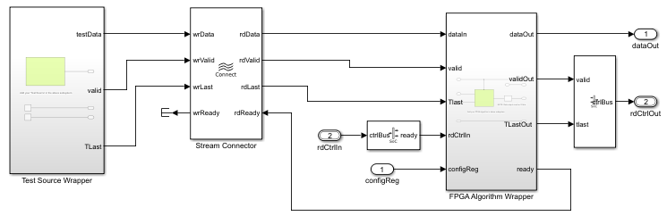 Обертка алгоритма FPGA - дважды щелкните, чтобы открыть модель. Оболочка алгоритма содержит подсистему, выделенную зеленым цветом, с именем FPGA Algorithm. Этот блок имеет два входа и один выход и реализован как множитель. Замените этот блок собственным алгоритмом FPGA. При необходимости добавьте входные и выходные данные.