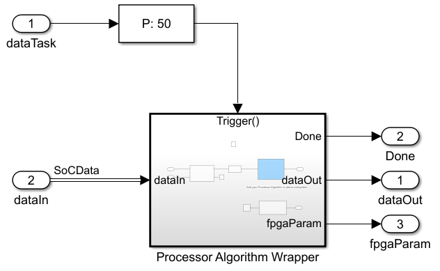 На панели инструментов MATLAB на вкладке «Ярлыки проекта» выберите «Открыть модель процессора». Оболочка процессора содержит подсистему, выделенную синим цветом и представляющую код пользователя для алгоритма процессора. Откройте оболочку Processor Algorithm и замените блок Processor Algorithm требуемым алгоритмом.