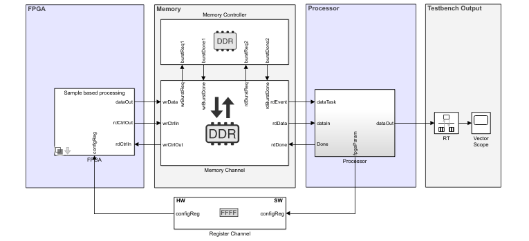 Этот шаблон моделирует счетчик как источник тестовых данных и минимальную логику для алгоритмов FPGA и процессора. Используйте этот шаблон в качестве руководства и замените алгоритм FPGA и алгоритм процессора собственными функциональными возможностями. Алгоритм FPGA представляет собой простое умножение входных данных из тестового источника и из параметра configReg. Процессор записывает файл configReg. Этот параметр моделируется с использованием блока Register Channel. Данные из алгоритма FPGA передаются процессору через блок канала памяти. Для параметра memory Channel Type установлено значение AXI4-Stream to Software via DMA, которая моделирует передачу данных DMA через общую внешнюю память.