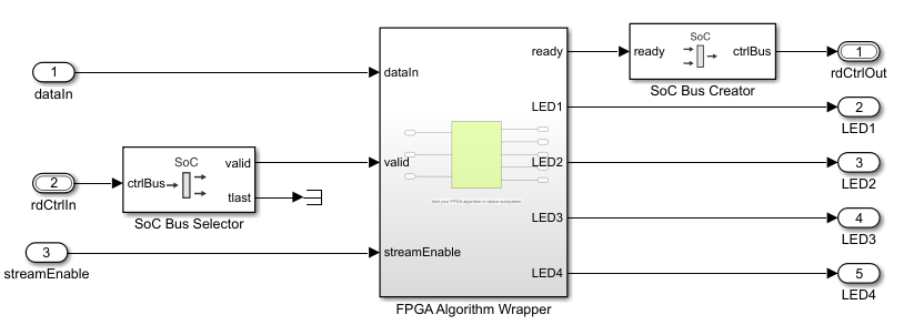 Дважды щелкните подсистему обертки алгоритма FPGA, чтобы открыть модель. Алгоритм FPGA извлекает четыре бита из входных данных для возбуждения светодиодов на аппаратных средствах. Состояние этих светодиодных индикаторов указывает на то, что процессор записывает данные потока в FPGA. Замените этот блок собственным алгоритмом FPGA. При необходимости добавьте входные и выходные данные.