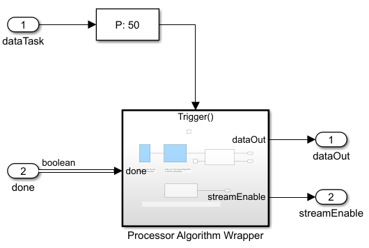 В окне MATLAB ® Toolstrip на вкладке Ярлыки проекта (Project Shortcuts) щелкните Открыть модель процессора (Open Processor model), чтобы открыть модель процессора. В подсистеме оболочки алгоритма процессора две области выделены синим цветом (который представляет код пользователя), как показано на этом рисунке. Одна выделенная область появляется в блоке «Алгоритм процессора», а другая выделенная область - в блоке «Тестовый источник».