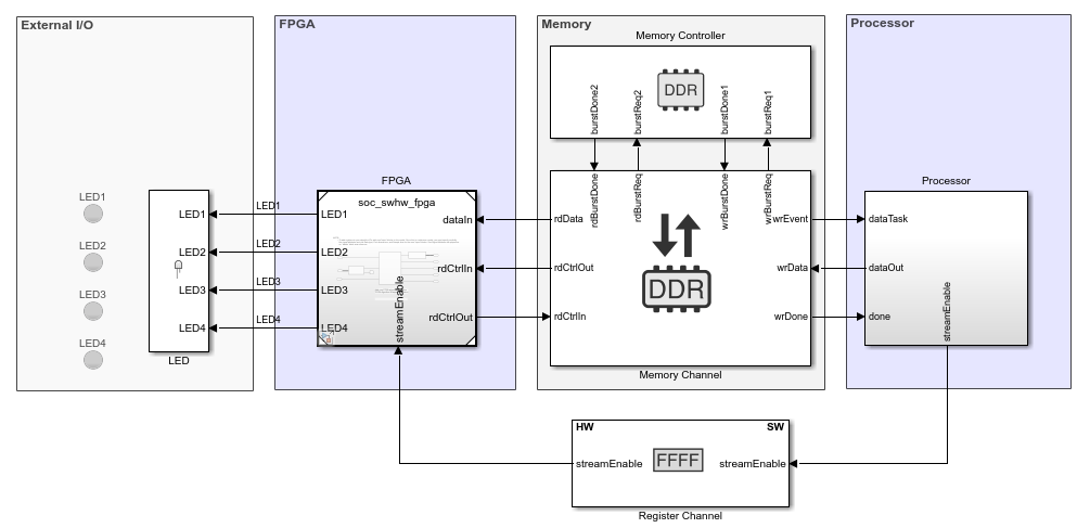 Процессор управляет выходным сигналом готовности в подсистеме оболочки алгоритма FPGA с помощью порта streamEnable. Процессор передает данные в FPGA через блок канала памяти. Параметр Channel Type в блоке Memory Channel имеет значение Software to AXI4-Stream via DMA для моделирования передачи данных прямого доступа к памяти (DMA) через совместно используемую внешнюю память.
