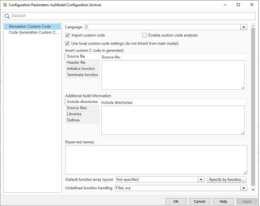 Откроется диалоговое окно Параметры конфигурации (Configuration Parameters). Откройте панель «Пользовательский код моделирования».