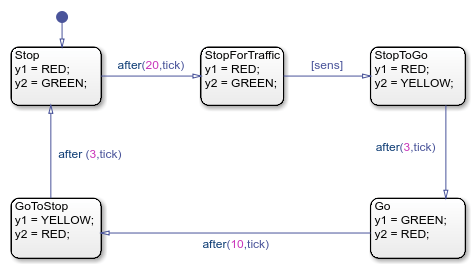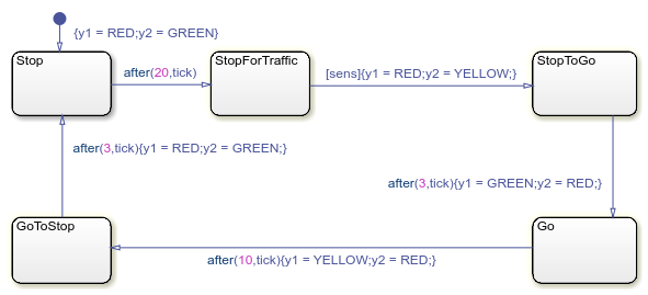 В этом примере показано, как использовать диаграмму Мура для моделирования светофора, как описано в разделе Модель светофора с использованием семантики Мура.