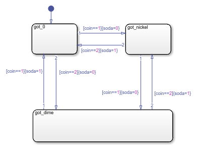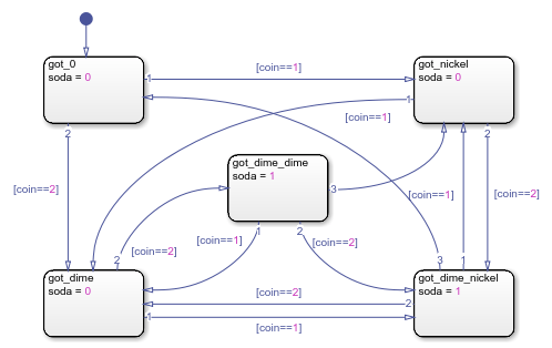 В этом примере показано, как использовать диаграмму Mealy для моделирования торгового автомата, как описано в разделе Модель торгового автомата с помощью Mealy Semantics.