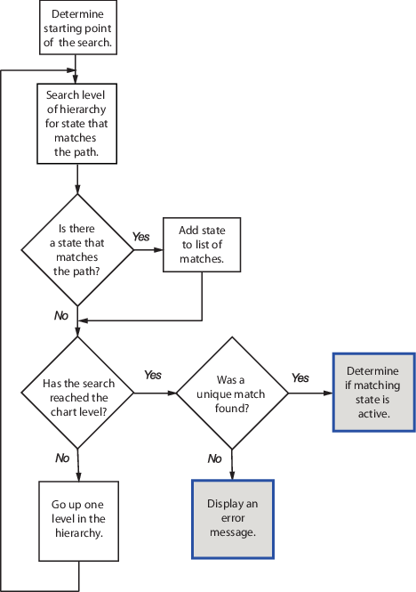 Процесс разрешения выполняет поиск пути к состоянию на каждом уровне иерархии диаграммы. Если состояние соответствует пути, процесс добавляет это состояние в список возможных соответствий. Затем процесс продолжает поиск на один уровень выше в иерархии. Процесс разрешения останавливается после поиска на уровне диаграммы иерархии. Если существует уникальное совпадение, диаграмма проверяет, активно ли соответствующее состояние. В противном случае процесс разрешения завершается неуспешно. Моделирование прекращается с ошибкой.