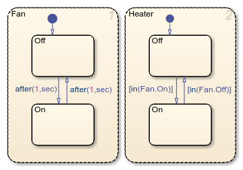 Например, на этой диаграмме: Fan и Heater являются параллельными состояниями (AND). Каждое состояние имеет пару подстанций, On и Off. Каждый раз, когда диаграмма просыпается, активное подсостояние государства Fan чередования между Fan.Off и Fan.On. В состоянии Heaterусловия на переходах проверяют активность подсостояния в Fan и синхронизировать состояния. Изменение активного подсостояния в Fan вызывает соответствующее изменение активного подсостояния в Heater.