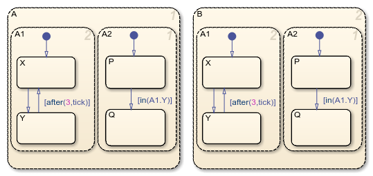 in ОператорВ диаграмме Stateflow ® с разложением параллельных состояний подсостояния могут быть активны одновременно. Для координации поведения различных параллельных состояний одно состояние может проверять активность подсостояния другого состояния и реагировать соответствующим образом. Например, одно состояние может поддерживать свои подсостояния синхронизированными с подсостояниями другого состояния.