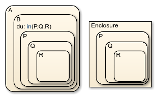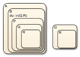 На этой диаграмме during действие в состоянии A.B содержит выражение in(Q.R). При разрешении имени квалифицированного состояния Q.R, Stateflow не может обнаружить подсостояние A.B.P.Q.R.