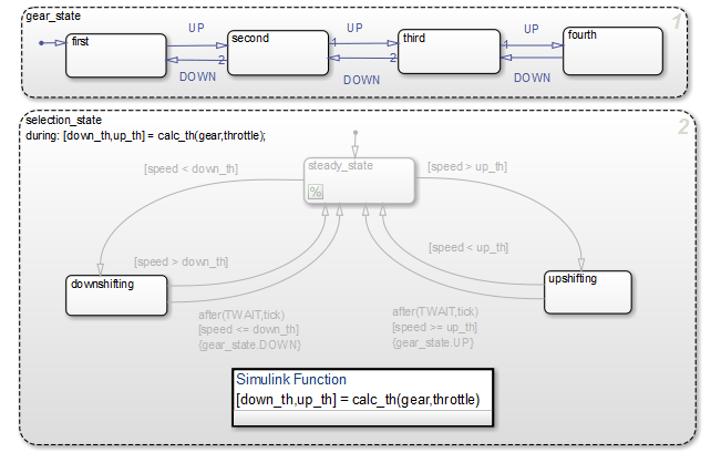 Программа неявно комментирует некоторые связанные объекты. Объекты с неявными комментариями также отображаются серым цветом, но не имеют значка. Например, если явно комментировать состояние или соединение, все входящие и исходящие переходы неявно комментируются. В этом образе sf_car, состояние steady_state явно комментируется. Переходы в и из steady_state неявно комментируются.
