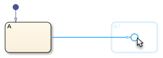 При добавлении перехода к диаграмме в редакторе Stateflow ® имеются графические подсказки, позволяющие добавить соединение или состояние. Чтобы разместить соединение в конце перехода, щелкните значок кругового соединения.