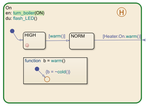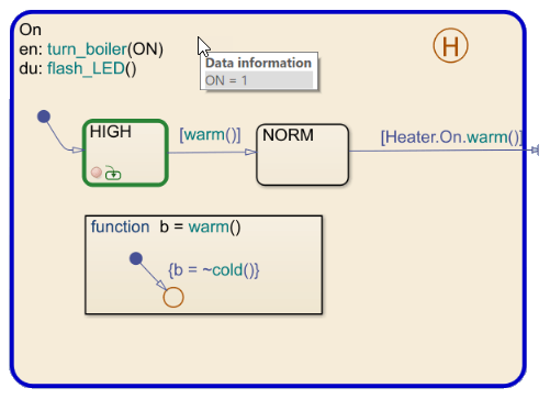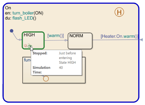 Когда диаграмма Stateflow переходит в режим отладки, редактор выделяет активные элементы синим цветом, а исполняемый объект - зеленым. Например, эта диаграмма приостановлена на entry точка останова в HIGH состояние. Активное состояние (On) выделен синим цветом, а исполняемый подсостояние (HIGH) выделяется зеленым цветом.