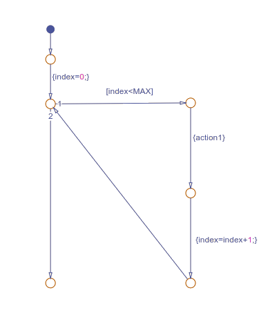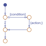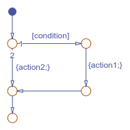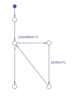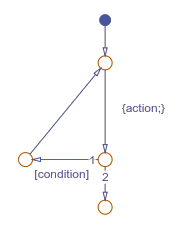 Во внешнем редакторе Stateflow ®for контур, выберите вертикальный переход с меткой {action1}.