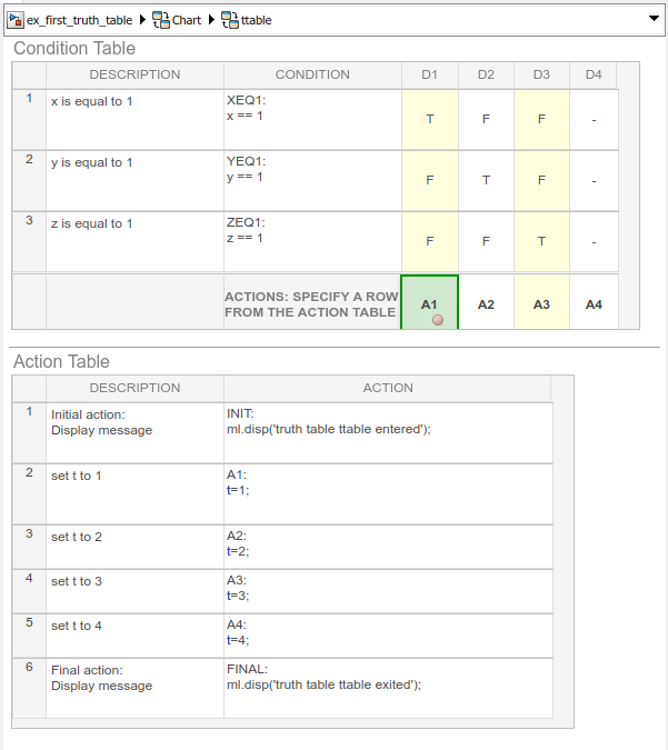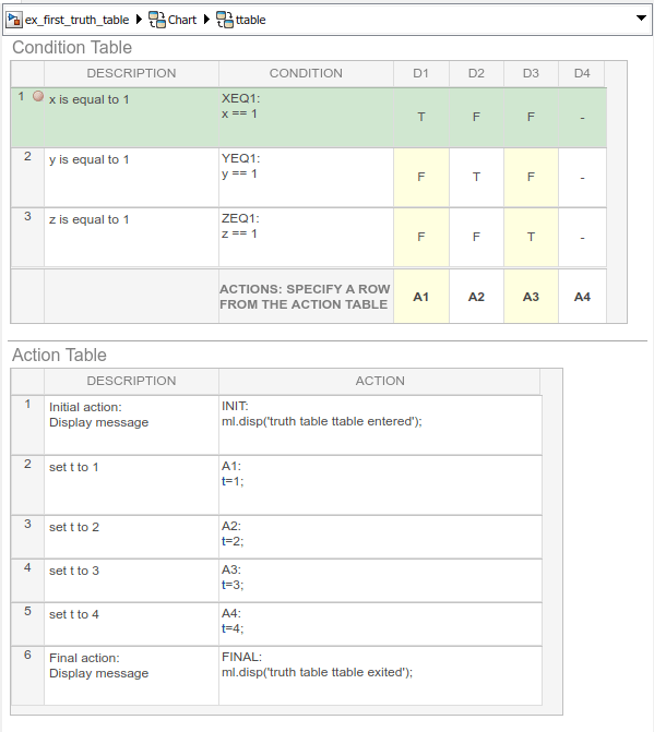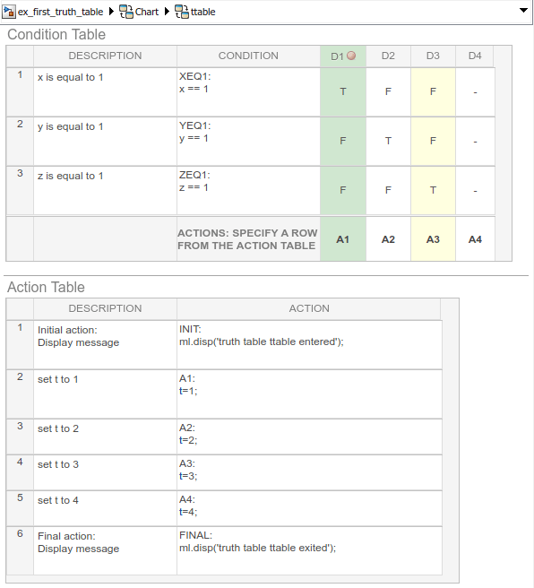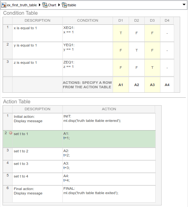 Если при принятии решения необходимо выполнить несколько действий, точка останова устанавливается для первого исполняемого файла. В таблицах истинности, использующих MATLAB в качестве языка действий, можно задать точку останова в любой строке исполняемого кода, задав точки останова в сгенерированном содержимом. См. раздел Отладка содержимого сгенерированной таблицы истинности.