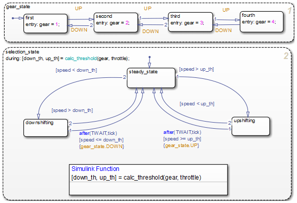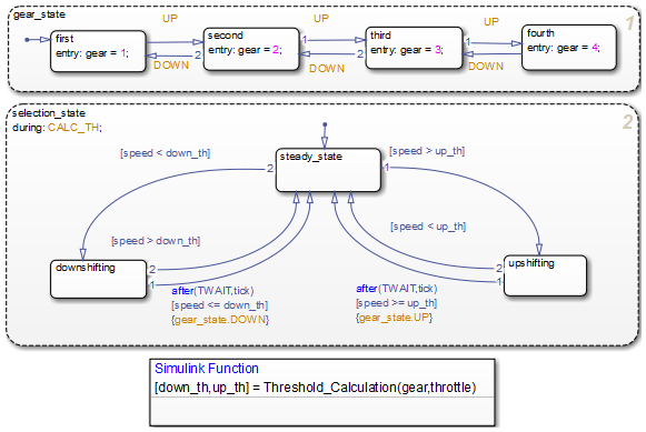 Функция находится в этом состоянии, а не на уровне диаграммы, поскольку ни одно другое состояние диаграммы не требует вывода функции up_th и down_th. См. раздел Привязка функции Simulink к состоянию.