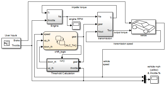 old_sf_car модель содержит подсистему вызова функции с именем Threshold Calculation и диаграмму Stateflow с именем shift_logic. Два блока взаимодействуют следующим образом: