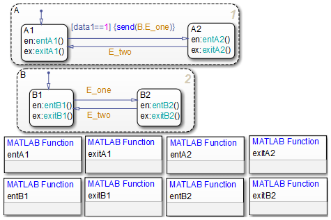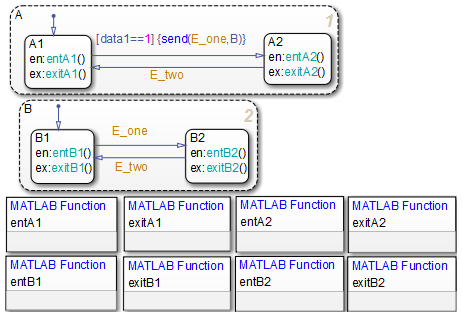 Первоначально чарт спит. Параллельные подстанции A.A1 и B.B1 являются активными, что подразумевает, что параллельные (И) сверхсостояния A и B также активны. Условие [data1==1] является правдой. Событие E_one принадлежит диаграмме и видим для обеих A и B.