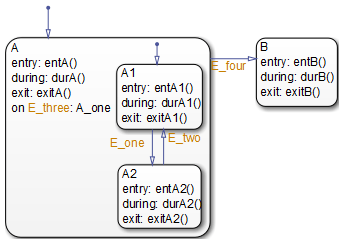 Эта последовательность завершает выполнение этой диаграммы Stateflow ®, связанной с событиемE_three.