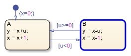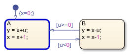 u не удовлетворяет условию [u<0] к переходу из состояния A, это состояние остается активным и значения x и y увеличение до 2. Теперь на панели «Символы» отображаются значения u = 1, x = 2, и y = 2.