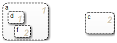 При удалении состояния верхнего уровня b и подсостояние e, диаграмма автоматически переупорядочивает оставшиеся параллельные состояния и подсостояния для сохранения неявного геометрического порядка:
