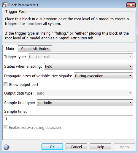 В диалоговом окне установите для параметра Тип времени образца значение periodic включает поле Sample time, в котором по умолчанию установлено значение 1. Эти параметры определяют выполнение функции для каждого временного шага, указанного в поле Sample time, пока функция включена.