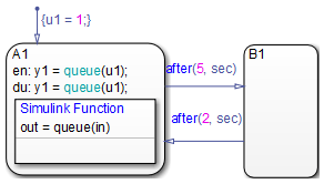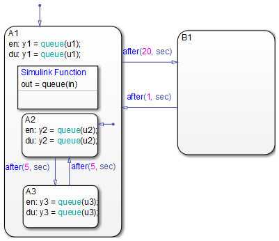 Например, на следующей диаграмме Stateflow показана функция Simulink, которая привязывается к состоянию.