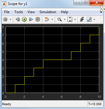 Когда состояние A1 становится неактивным при t = 5, функция Simulink не удерживает значение счетчика. Когда A1 снова активен при t = 7, счетчик сбрасывается в ноль. Следовательно, выходные данные y1 также сбрасывается.