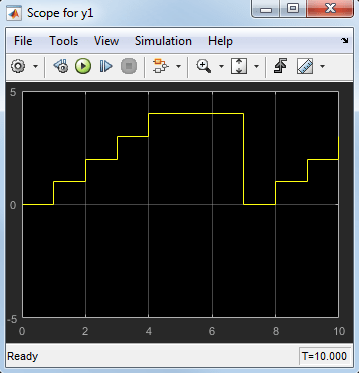 Когда состояние A1 становится неактивным при t = 5, функция Simulink удерживает значение счетчика. Когда A1 снова активен при t = 7, счетчик имеет то же значение, что и при t = 5. Следовательно, выходные данные y1 продолжает увеличиваться во времени.