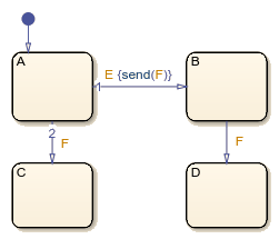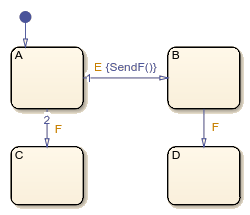Например, на этой диаграмме входные события E и F инициировать переходы между состояниями. Предположим, что SendF - функция в пути MATLAB, вызывающая входную функцию события F.