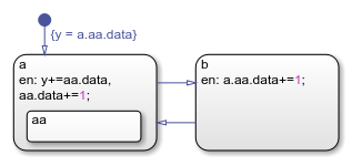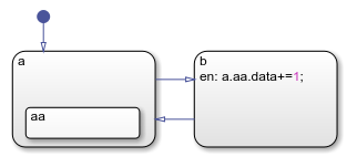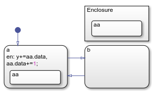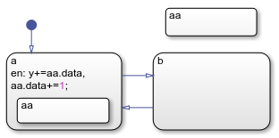На этой диаграмме действие ввода в состоянии b содержит полное имя данных aa.data. Если символ data находится в состоянии aa, то Stateflow не может разрешить полное имя данных.
