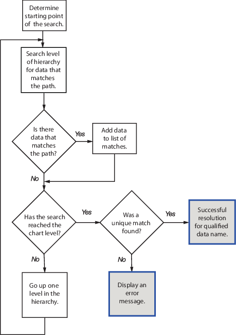 Процесс разрешения выполняет поиск пути к данным на каждом уровне иерархии диаграмм. Если объект данных соответствует пути, процесс добавляет этот объект данных в список возможных совпадений. Затем процесс продолжает поиск на один уровень выше в иерархии. Процесс разрешения останавливается после поиска на уровне диаграммы иерархии. Если существует уникальное совпадение, соответствующее имя данных преобразуется в соответствующий путь. В противном случае процесс разрешения завершается неуспешно. Моделирование останавливается, и появляется сообщение об ошибке.