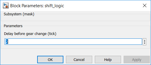Выбор параметров для изменения осуществляется с помощью интерфейса пользователя маски. Можно предоставить значимые описания этих параметров. Например, в модели sf_car, shift_logic диаграмма имеет маску, с помощью которой можно настроить параметр TWAIT. Чтобы открыть диалоговое окно Параметры маски, дважды щелкните диаграмму потока состояний. Это диалоговое окно содержит описание параметра "Delay before gear change (tick)"и поле для изменения значения. Это значение привязано к параметру TWAIT внутри маски. При редактировании значения в этом поле Stateflow присваивает новое значение TWAIT во время моделирования.