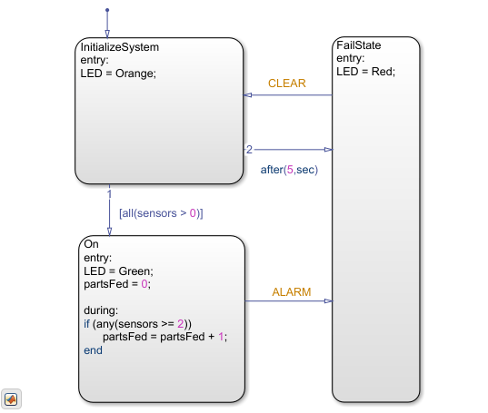 Значок MATLAB в левом нижнем углу диаграммы показывает, что используется диаграмма Stateflow с синтаксисом MATLAB.