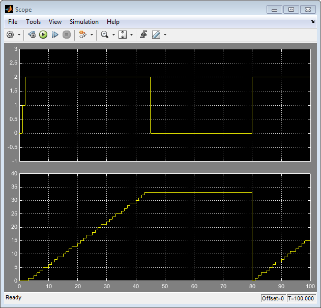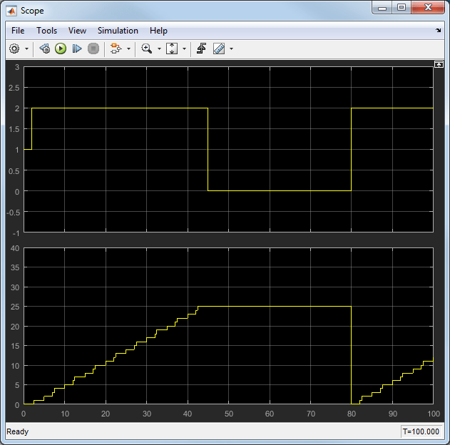 Дважды щелкните блок Scope, чтобы убедиться, что модель фиксирует ожидаемое поведение питателя.