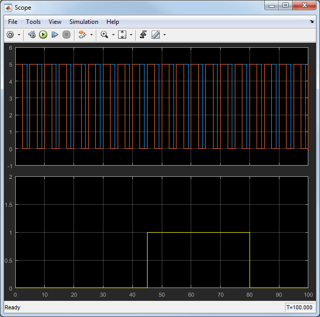 Запустите модель для просмотра выходного сигнала датчика и аварийных сигналов в блоке Scope.