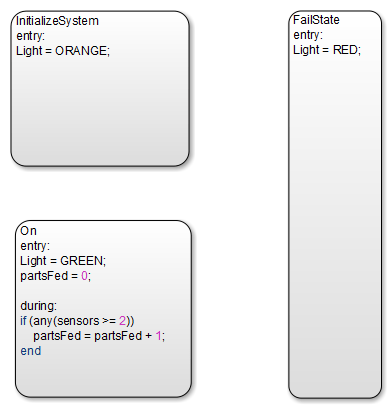 Например, можно использовать entry действия по инициализации данных, during действия по обновлению данных и exit действия по настройке данных для следующего перехода. Дополнительные сведения о других типах действий состояния см. в разделе Синтаксис состояний и переходов.)
