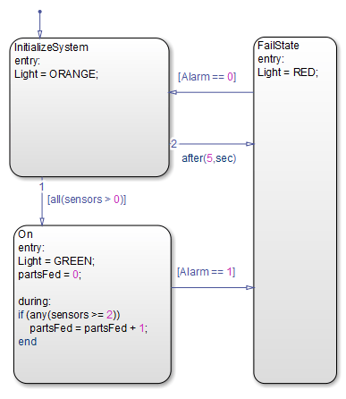 Исходящие переходы из InitializeSystem имеют небольшие метки 1 и 2 для указания порядка, в котором вычисляются переходные сегменты. Если числа из рисунка не соответствуют модели, щелкните правой кнопкой мыши переход, а затем измените его, щелкнув значок Execution Order. Дополнительные сведения см. в разделе Порядок оценки перехода.
