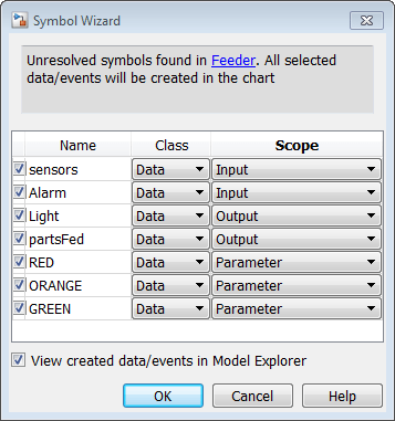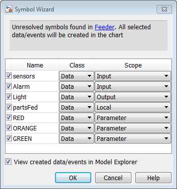 Мастер графических образов не добавляет данные в диаграмму автоматически. Он идентифицирует неразрешенные данные и выводит класс и объем этих данных с помощью правил вывода выражений MATLAB в действиях Stateflow. На диаграмме:
