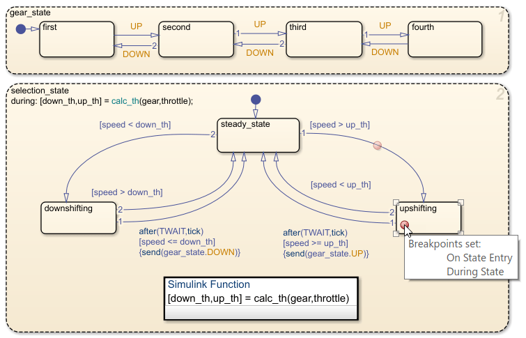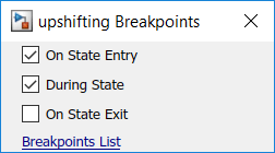 Значок точки останова может представлять несколько типов точек останова. Чтобы просмотреть всплывающую подсказку со списком типов точек останова, заданных для объекта Stateflow, укажите на его значок. В этом примере значок на государстве upshifting представляет два типа точек останова: On State Entry и During State.