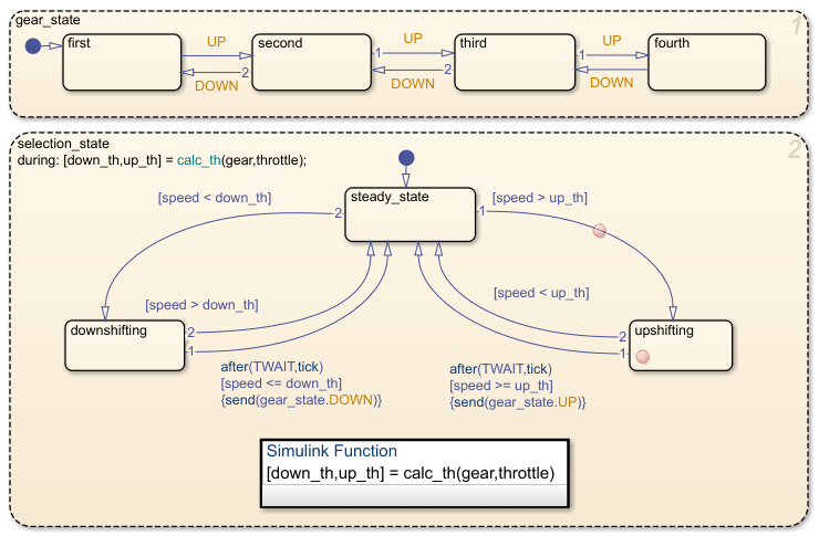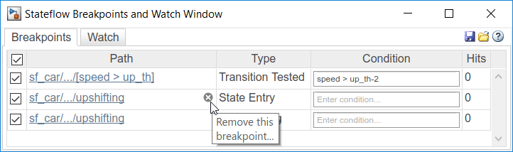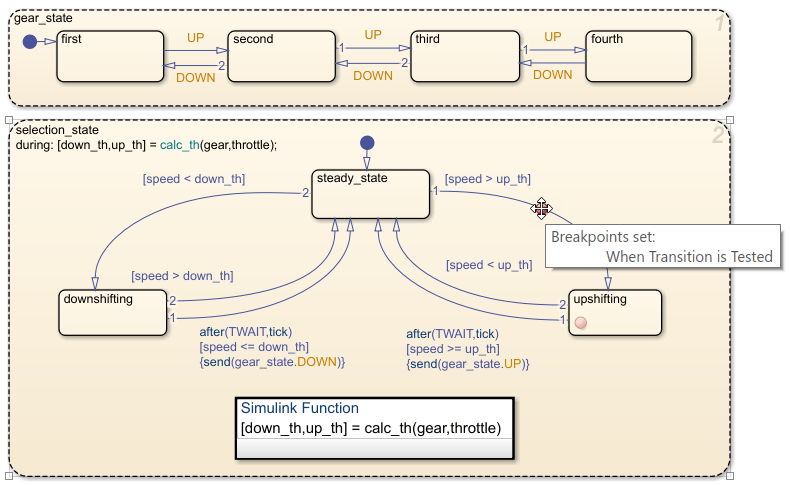 Например, эта диаграмма имеет точку останова в переходе от steady_state кому upshifting. Эта точка останова останавливает моделирование каждый раз при тестировании перехода, даже если значение speed намного ниже up_th.