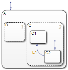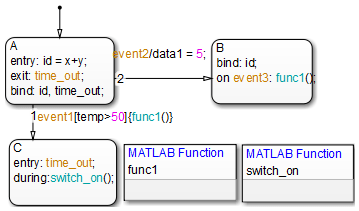 В предыдущем примере операция ввода id = x+y выполняется, когда диаграмма принимает переход по умолчанию и состояние A становится активным. См. раздел Ввод диаграммы или состояния.