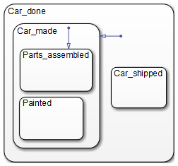 В этом примере диаграмма является родительским элементом состояния Car_done. Государство Car_done является родительским состоянием Car_made и Car_shipped штатов. Государство Car_made также является родителем Parts_assembled и Painted штатов. Можно также сказать, что штаты Parts_assembled и Painted являются детьми Car_made состояние.