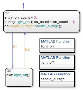 Метка состояния начинается с имени состояния, за которым следует необязательный / персонаж. В предыдущем примере имена состояний: On и Off. Допустимые имена состояний состоят из буквенно-цифровых символов и могут содержать символ подчеркивания (_) символ. Дополнительные сведения см. в разделе Рекомендации по именованию объектов Stateflow.