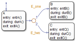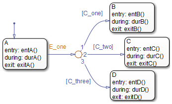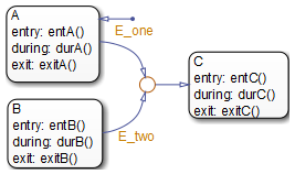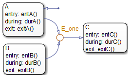 Корень диаграммы проверяет наличие допустимого перехода в результате E_one. Допустимый сегмент перехода из состояния A к соединительному соединению существует. Поскольку применяется неявное упорядочение, сегмент перехода, помеченный условием, оценивается на достоверность. Потому что состояние [C_one] недействителен, полный переход из состояния A указывать B недопустим. Сегмент перехода из соединительного соединения обратно в состояние A является действительным.
