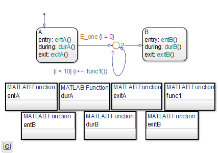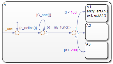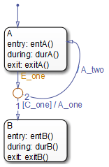 Корень диаграммы проверяет наличие допустимого перехода в результате E_one. Существует допустимый сегмент перехода из состояния A к соединительному соединению. Действие условия сегмента перехода, i = 0, выполняет и завершает. Из двух переходных сегментов, выходящих из соединительного соединения, переходный сегмент, который является самокольцом, возвращается к соединительному соединению, оценивается следующим для достоверности. Этот сегмент имеет приоритет при оценке, поскольку он имеет условие, в то время как другой сегмент не помечен. Это поведение оценки отражает неявный порядок исходящих переходов в диаграмме.