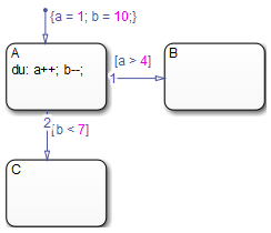 Переход по умолчанию в состояние A присваивает данные a равно 1 и данные b равно 10. during действие состояния A приращения a и уменьшения b в течение каждого временного шага. Переход из состояния A указывать B является действительным, если условие [a > 4] является правдой. Переход из состояния A указывать C является действительным, если условие [b < 7] является правдой. Во время моделирования существует временной шаг, на котором состояние A является активным, и оба условия являются истинными. Этот вопрос является конфликтом переходного периода.