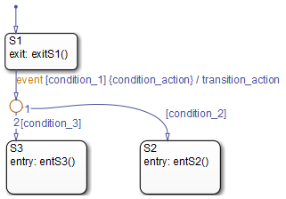 Формат метки для сегмента перехода, входящего в соединение, тот же, что и для переходов, входящих в состояния, как показано в следующем примере. Диаграмма использует неявный порядок исходящих переходов (см. Неявный порядок).