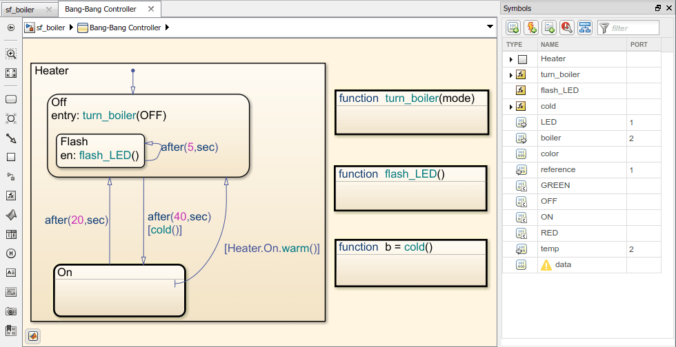 На панели «Символы» можно изменить имя, тип и номер порта объектов Stateflow. Измените имя объектов в поле ИМЯ. При переименовании объекта нажмите Shift + Enter, чтобы переименовать все экземпляры объекта в конечном автомате. Чтобы изменить тип или номер порта объекта, щелкните соответствующее поле и выберите один из доступных параметров. Чтобы удалить объект из конечного автомата, щелкните его правой кнопкой мыши и выберитеDelete.