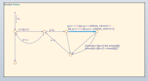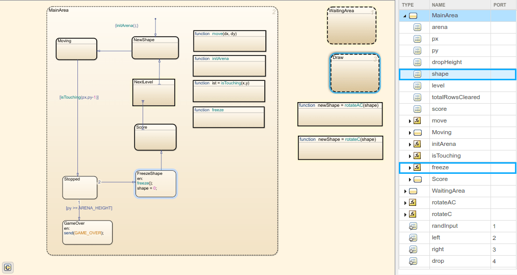 Можно также выбрать графический объект, например состояние, переход или функцию, на диаграмме и просмотреть символы, используемые объектом. Например, на диаграмме TetrisLogic, разверните обозначение MainArea на панели «Символы». При выборе состояния FreezeShape на диаграмме, затем локальные данные shape и функции freeze() выделяются на панели «Символы». Это выделение указывает на то, что эти объекты используются внутри состояния FreezeShape.