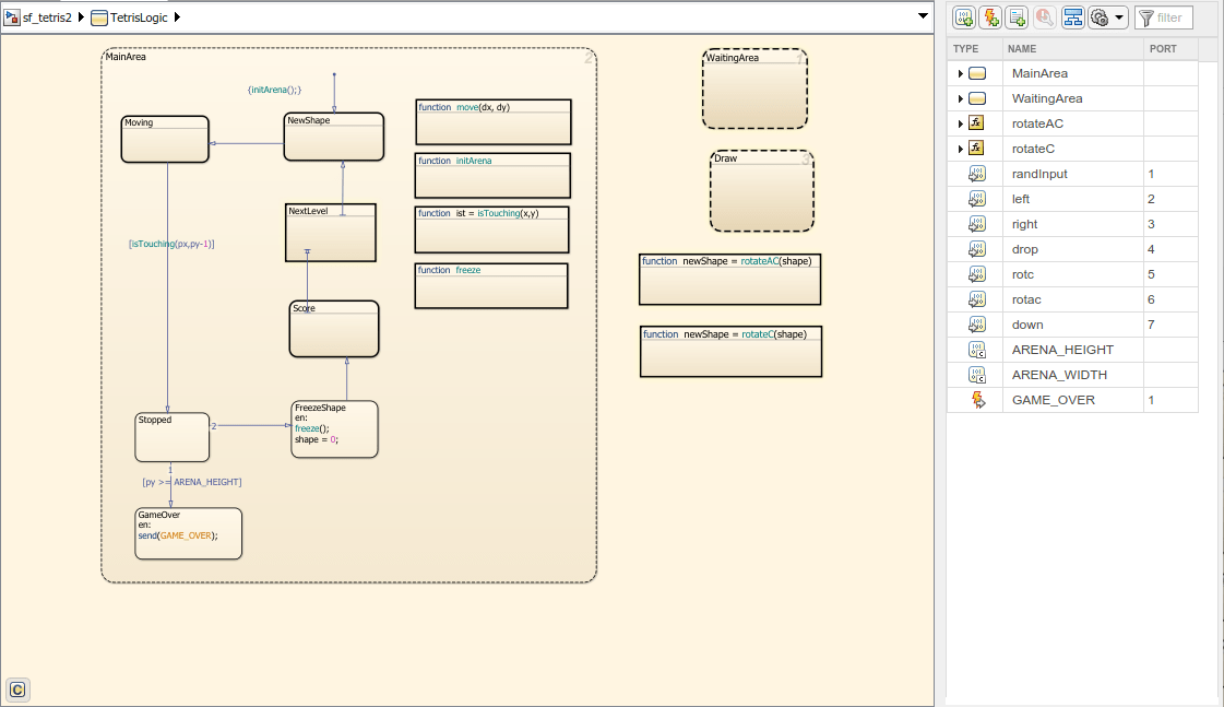Например, откройте модель sf_tetris2 и дважды щелкните диаграмму TetrisLogic. На панели «Символы» при выборе константы ARENA_HEIGHT, состояния и функции, которые используют ARENA_HEIGHT выделены. Если диаграмма не использует объект, символ появляется в окне с желтым значком предупреждения.![]()